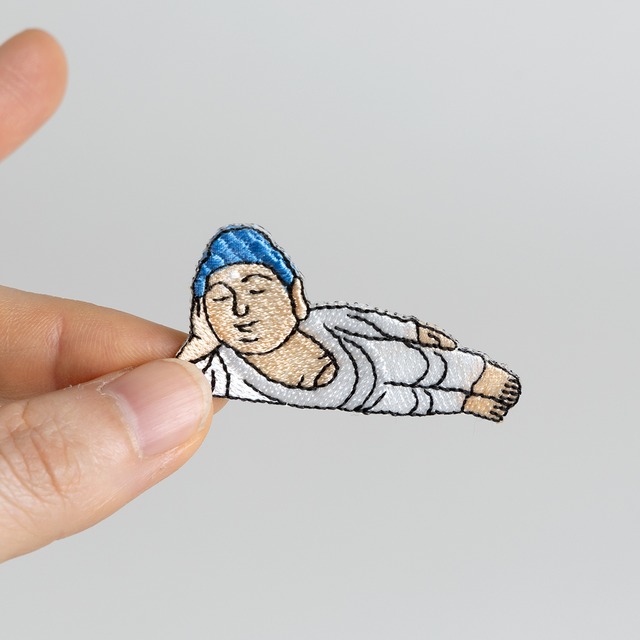 三浦耀山が彫った仏像がワッペンになりました。 涅槃仏(ねはんぶつ)は、仏陀(釈迦)の入滅(死)を表現した仏像。釈迦が涅槃に入る瞬間の横たわった姿で描かれ、生命の終わりと仏教の教えの完成を象徴している。 通常、釈迦が床に横たわり周囲を菩薩や弟子、動物たちが取り囲む姿で表され、穏やかな顔つきや安らかな表情が特徴。 サイズ: 5cm×2.5cm 素材: レーヨン100%